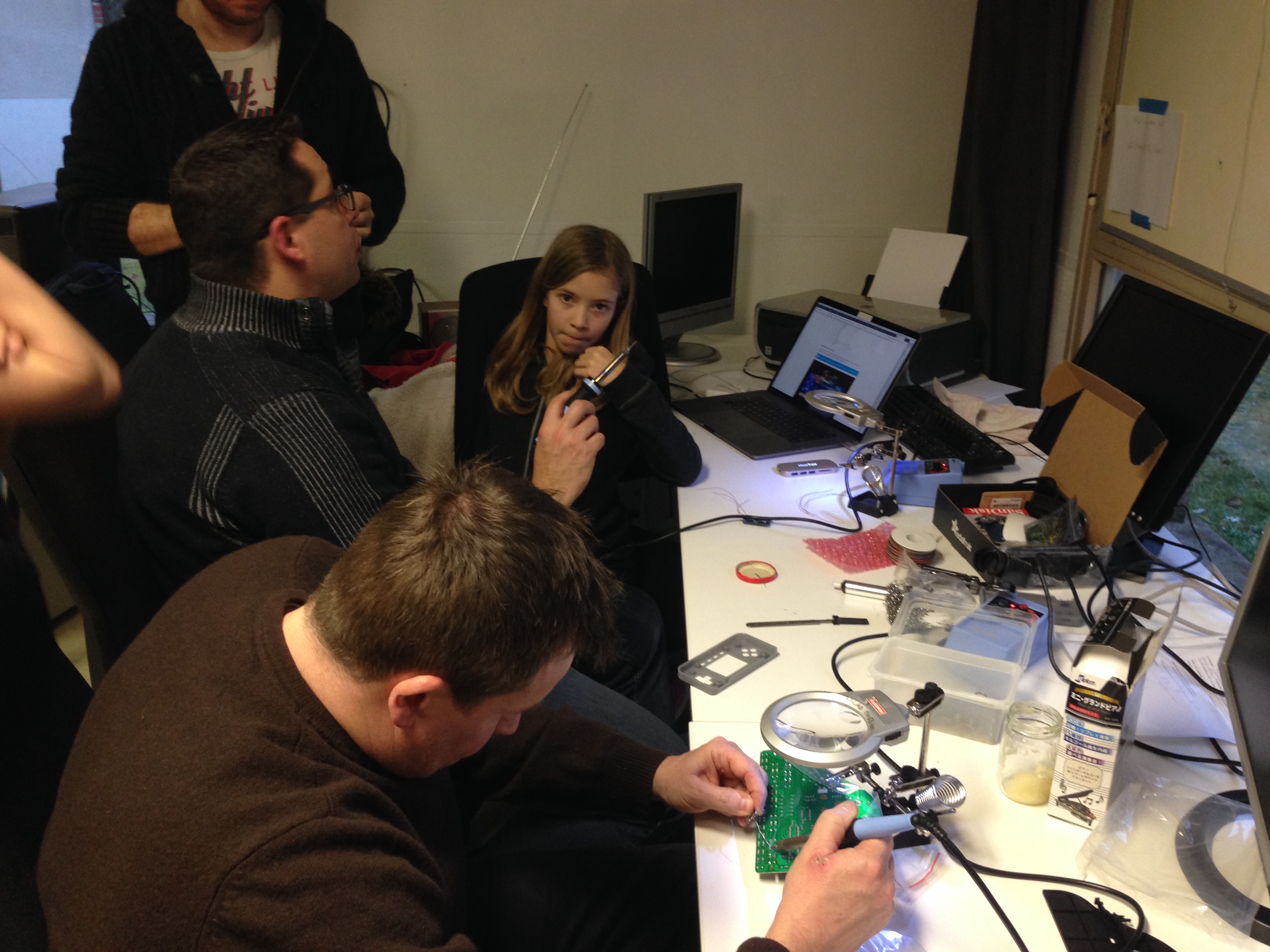 L’ambiance était chaude au FabLab hier avec beaucoup de monde et de projets en parallèle qui avançaient. Baptiste imprimait des pièces tout en prototypant des formes avec du carton aidé de Louis, alors que Hervé soudait des composant d’un petit piano musical en kit qu’il a ramené de son voyage au Japon. Henry découpait à la CNC et Baptiste / TEX continuait de régler sa grosse imprimante 3D, tandis que la fille de Némo soudait les composant d’une petite console portative.