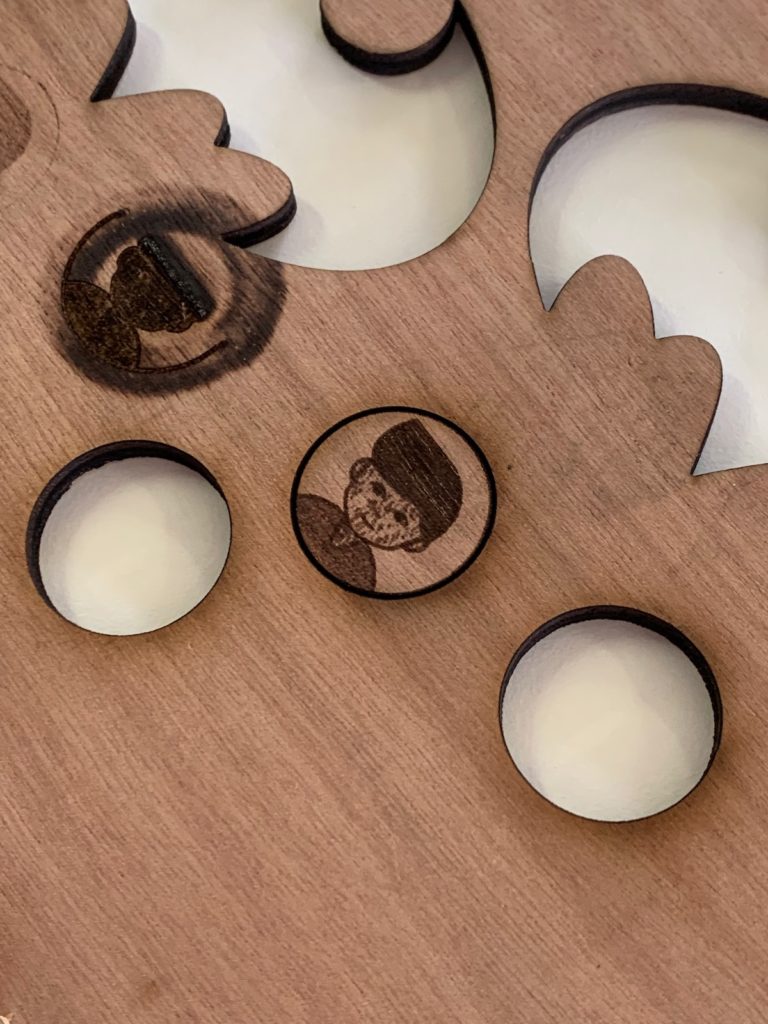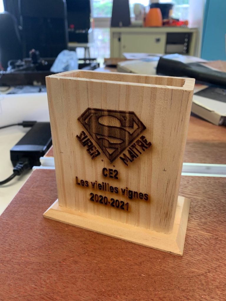 Cyril a fait de la gravure et de la découpe pour faire des cadeaux de fin d’année pour la classe de Melvin…