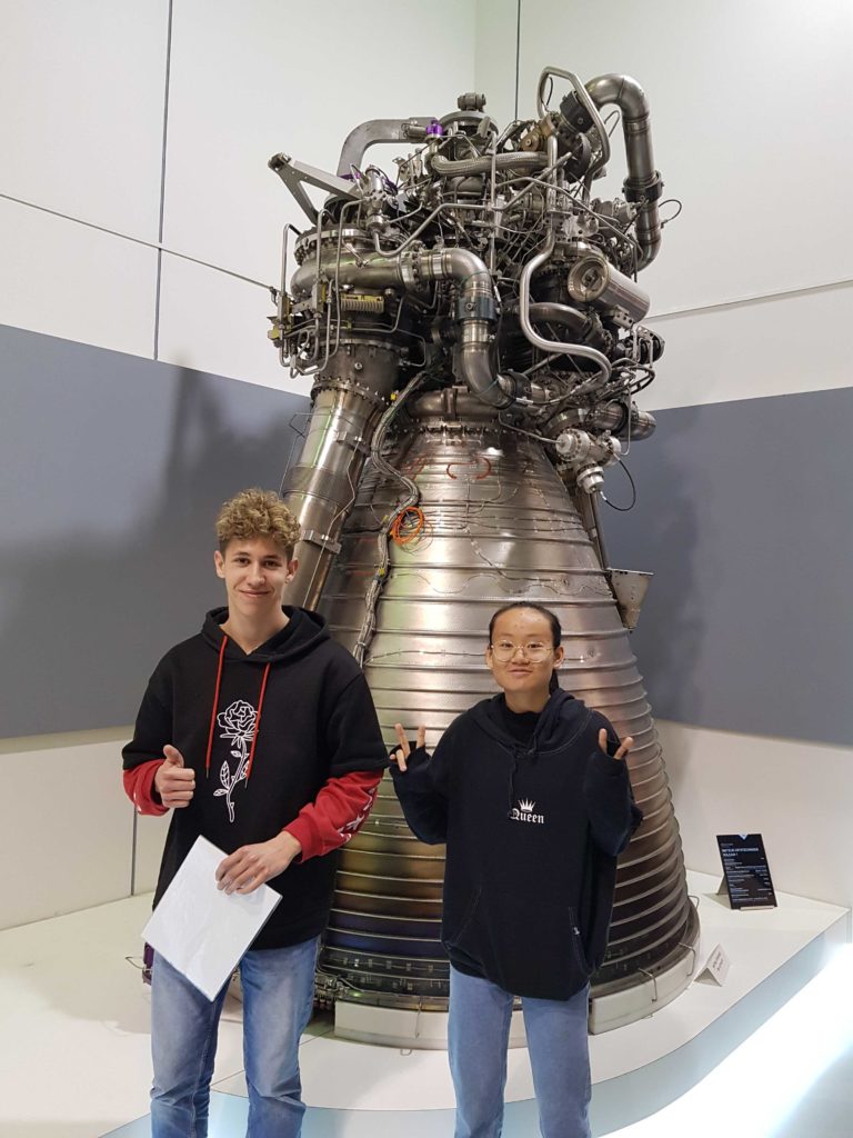 Les astropiistes devant un moteur vulcain d’Ariane 5