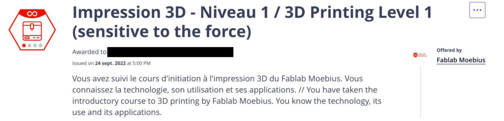 Normalement, les badges vous sont décernés à l’issue d’une ou plusieurs séances de formation ou la participation à certains projets (notamment les projets collectifs du Fablab).