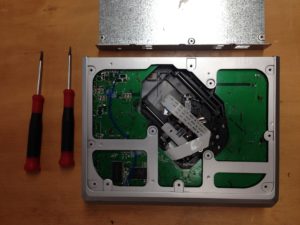 On apperçoit le système portant le faisceau laser sur des rails qui se déplace au cours de la lecture, le connecteur flatflex (débranché) reliant la tête de lecture à la carte électronique, le connecteur de l’écran à droite et les connecteurs des moteurs. En jouant un peu avec le système de déplacement de la tête de lecture, je remarque que la butée (un microswitch classique) n’est pas bien en place. S’est-elle déplacée pendant le démontage ou est-ce une partie du problème ? Je décide de remonter le tout pour faire une tentative… Et voilà ca remarche! Au final je ne sais pas quelle était la panne mais ce fut une opération plaisante et une demi-heure fructueuse.