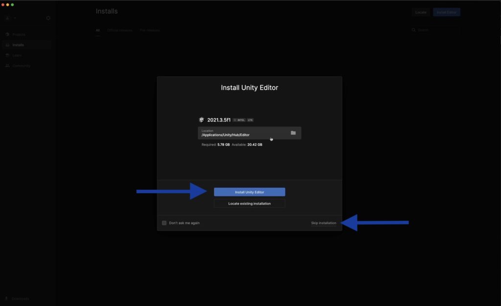 Une fois « Unity Hub » installé, il vous proposera d’installer une version par défaut de Unity Editor. Installez une version LTS de préférence (LTS = Long Term Support). Si la version qui vous est présentée n’est pas celle que vous souhaitez, cliquez sur « Skip installation ».