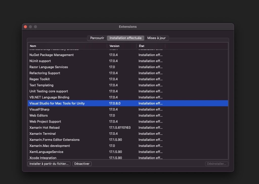 Pour mac, assurez-vous que dans les extensions (Visual Studio > Extensions) vous avez bien la ligne suivante dans l’onglet « installéations efectuées », normalement les outils sont installés par défauts.