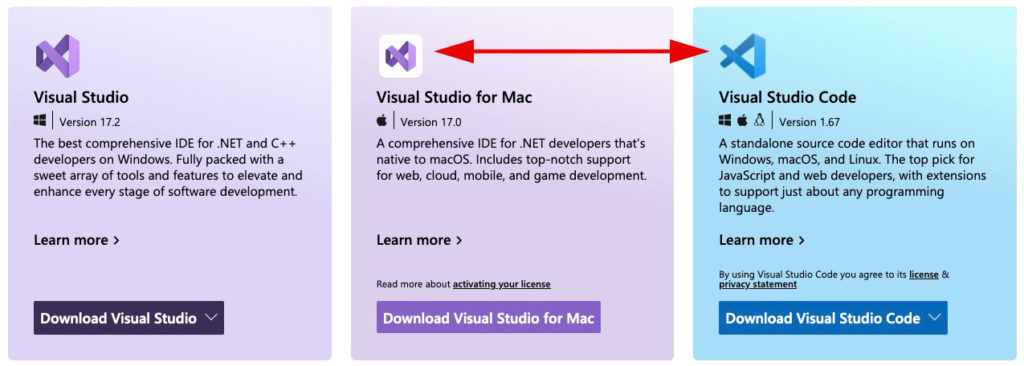 Une fois l’installation terminée, il faut télécharger et installer Visual Studio Community (sous windows) ou Visual Studio for Mac (sous mac OS) ou Visual Studio Code (sous linux). Attention Sous Mac : Visual Studio pour Mac et Visual Studio Code sont deux applications différentes. On les reconnait aux logo différents :
