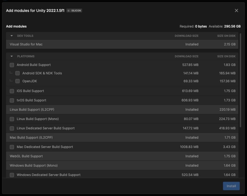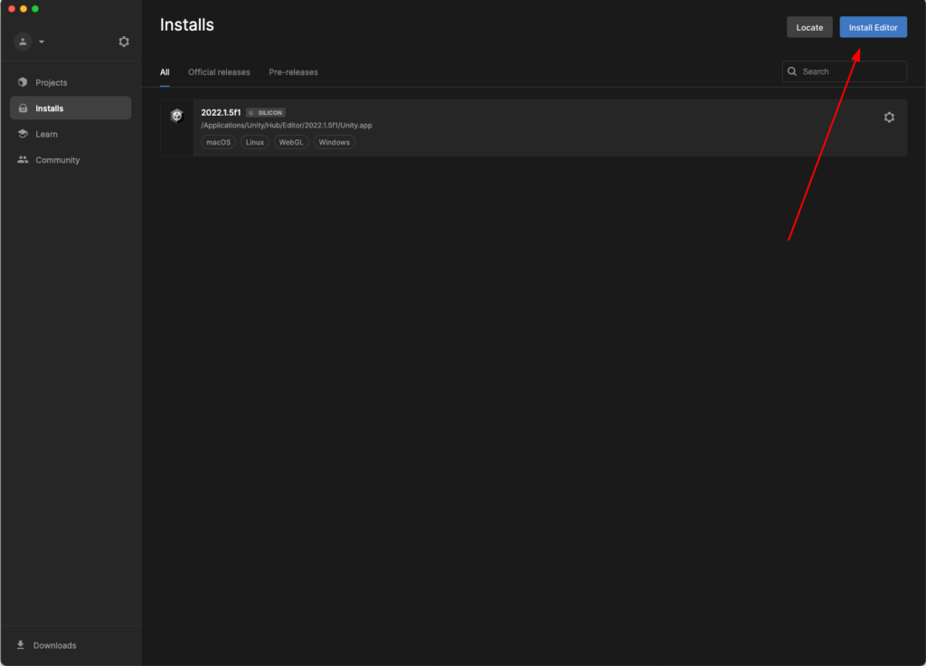 Unity Hub vous renvoit alors sur les installations déjà présentes, il vous suffit de cliquer sur « install editor » en haut à droite et de choisir la version adaptée à votre machine.
