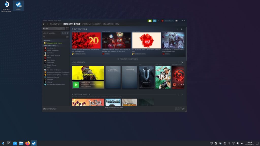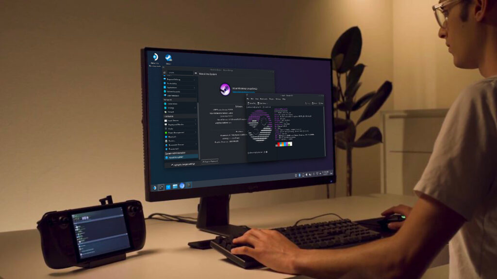 Et en y regardant de plus près, la console peut être utilisée comme ordinateur de bureau (en plus du mode console portable) en y branchant, clavier, souris et écran externe. Et là stupeur… la Steam Deck ne tourne pas sous windows… mais sous Steam OS 3.0 avec une nouvelle version de proton !! C’est à dire que la bestiole tourne… Sous Linux !! Cette version est basée sur Arch Linux (et non plus Debian) parce qu’elle intègre les mises à jour linux plus rapidement que Debian.