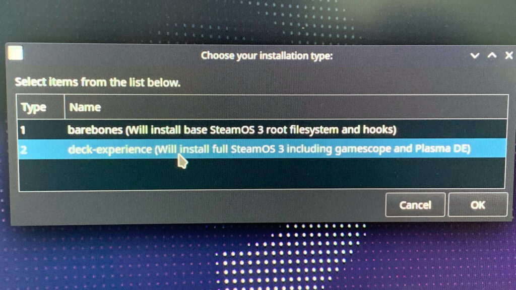 - Choisissez alors l’installation « Deck-experience ». Vous pourrez alors soit transformer votre PC en Console soit utiliser votre PC avec Linux Arch et le bureau KDE plasma.