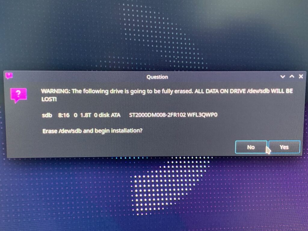 - Sélectionnez le disque sur lequel faire l’installation (si vous avez suivi mes conseils plus haut vous ne devriez avoir que le choix sda). Vous pouvez malgré tout tenter l’installation sur un deuxième disque (sdb), j’ai juste remarqué que cette installation sur un disque secondaire ne marchait pas toujours très bien pour l’instant…