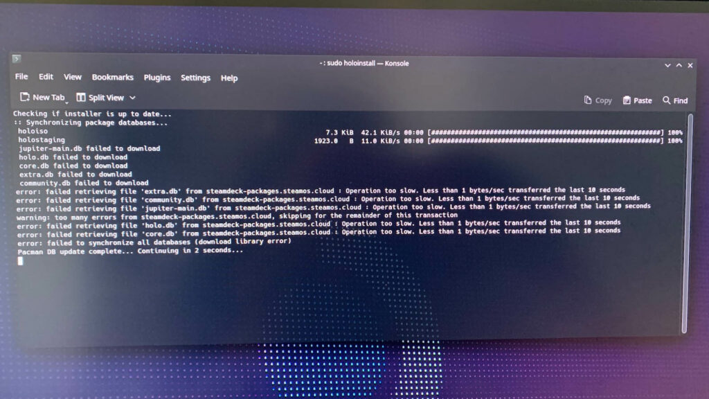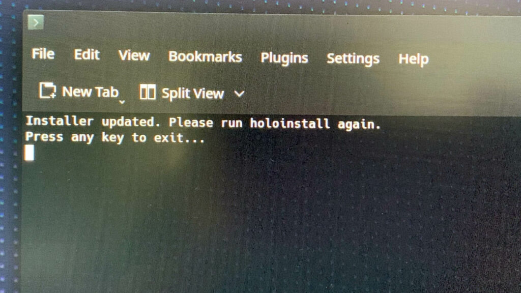 - Holoiso va faire un premier téléchargement (la mise à jour de l’installateur) puis vous demande de redémarrer. C’est normal, ne retirez pas la clé USB et relancez « install Steam OS » sur le bureau ou retappez la commande « Holoinstall ».