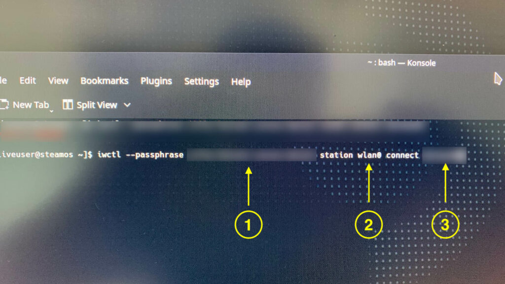 - Maintenant connectez vous à votre wifi (ou vérifiez que vous êtes connecté en filaire ) à l’aide de l’icône en bas à droite de l’écran. Si cela ne fonctionne pas (dans certains cas la liste des réseaux disponible est instable et saute régulièrement). Dans ce cas, connectez votre wifi en lançant le terminal (Konsole) : cliquez sur l’icone Steam OS en bas à gauche de l’écran et allez chercher le terminal dans system > Konsole. Puis tappez la commande :