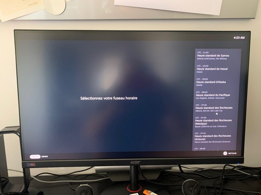 - Choisissez votre langue et votre fuseau horaire, puis l’installation devrait se dérouler sans problème (avec le téléchargement de Steam OS entre les deux). Au redémarrage, enlevez la clé USB.